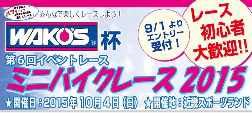 今年もやってきました、ワコーズ杯ミニバイクレース2015エントリー受付は絶賛受付中となっておりますエントリーは下記リンクよりDLして記載・捺印の上TWN加盟店までお持ち下さいもちろん、当店でも受付しておりますので、お気軽にお問い合わせ下さい120分耐久レーススプリントレースショップ対抗スクーターレースと、同日に協賛各社のブースやフリーマッケットも開催されます
