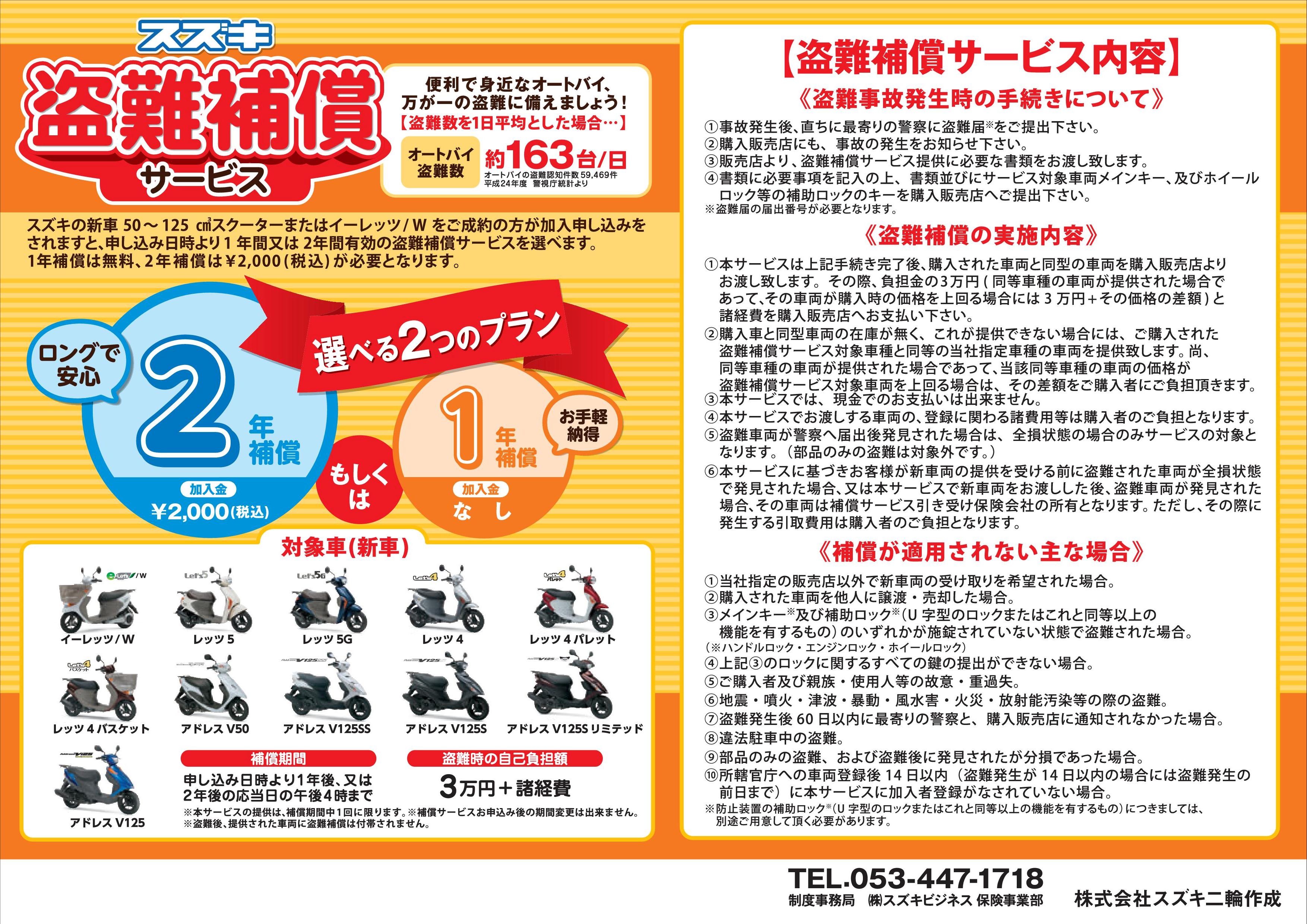 今年からスズキ新車(50~125cc)購入時の盗難保険の取扱が変わります